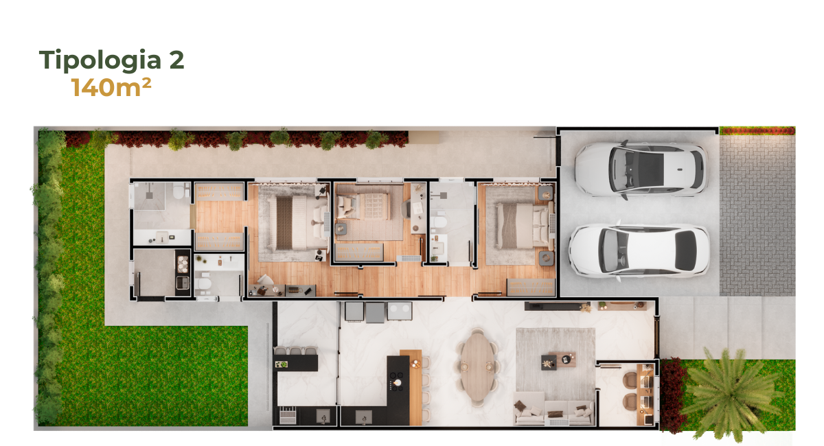 • Casas de 100m² – mesma tipologia, com variações de fachada para personalização visual.