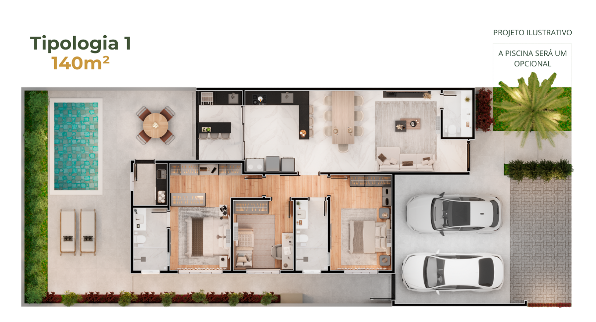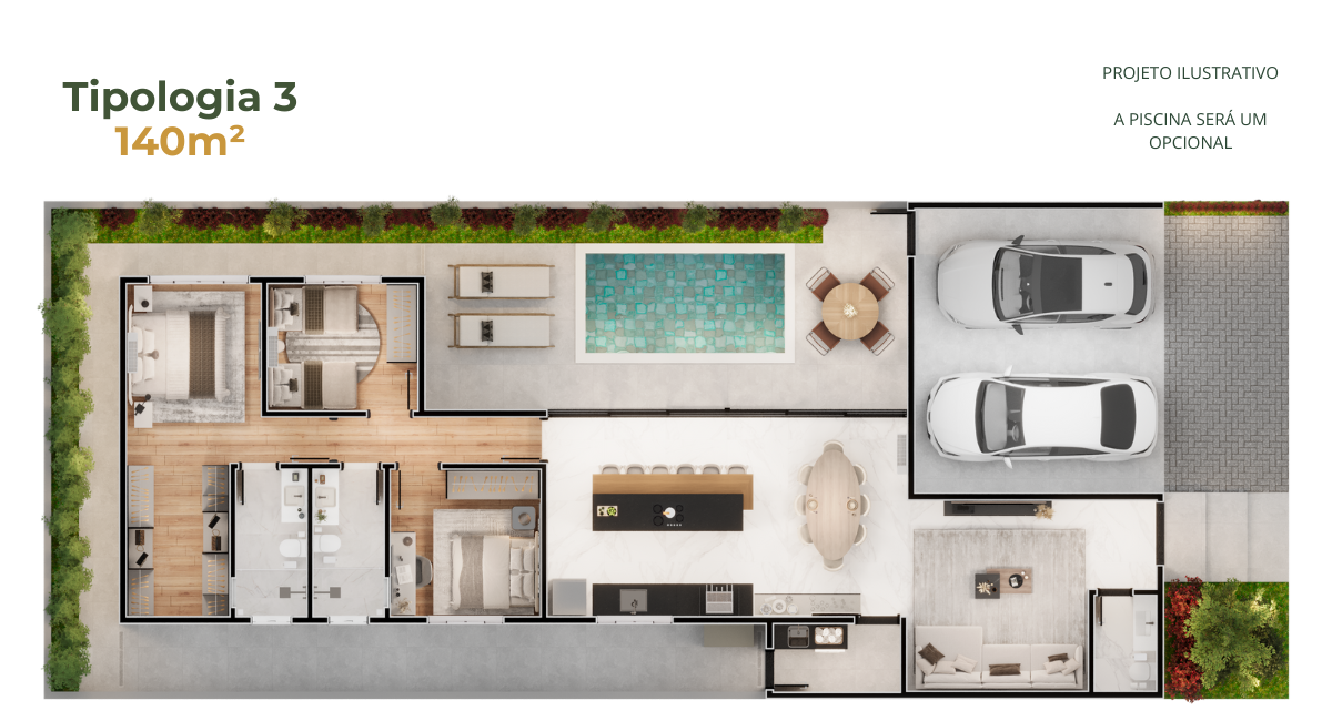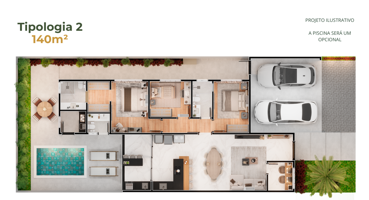 • Casas de 140m² – três tipologias diferentes, cada uma com três opções de fachada.