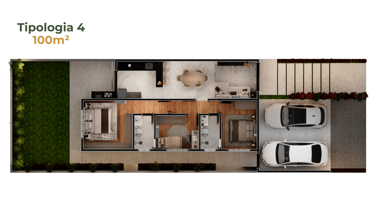 • Casas de 100m² – mesma tipologia, com variações de fachada para personalização visual.